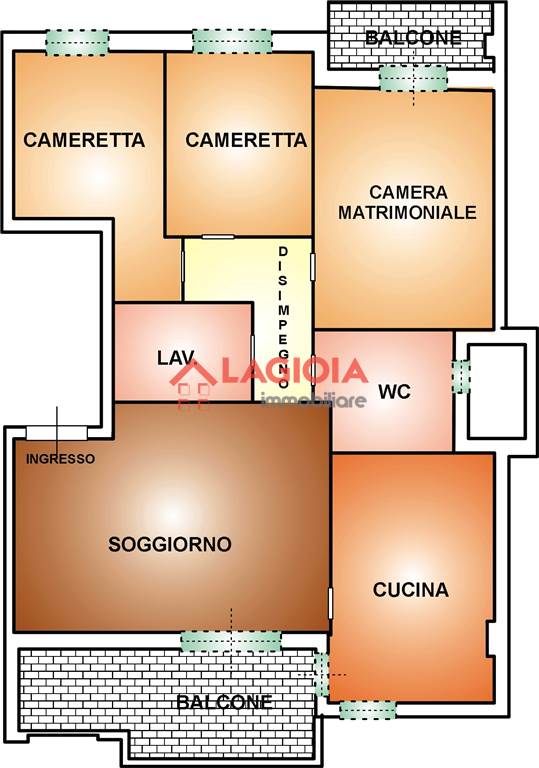 L’immobile è composto da ingresso con soggiorno a vista, cucina abitabile; entrambi gli ambienti si affacciano su un comodo balcone completo di ripostiglio esterno. Un funzionale disimpegno separa la zona giorno dalla zona notte dove troviamo bagno padronale con vasca, bagno di servizio adibito a lavanderia, camera matrimoniale con affaccio su balcone e due comode camerette.