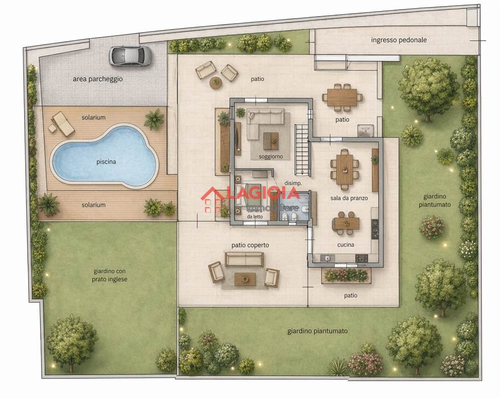 La proprietà è circondata da giardino curato , in parte piantumato con alberi ornamentali e in parte caratterizzato da un elegante prato inglese. L’abitazione ha un patio perimetrale che ne valorizza ogni lato offrendo spazi ideali per il relax all’aperto.